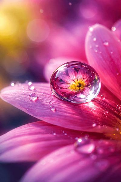 A stunning macro photography artwork capturing a delicate pink flower petal with a crystal-clear dew drop reflecting a blooming flower inside. The vibrant pink tones and dreamy bokeh background create a magical and peaceful atmosphere inspired by nature’s smallest details. Water droplets sparkle across the petals, adding texture and…