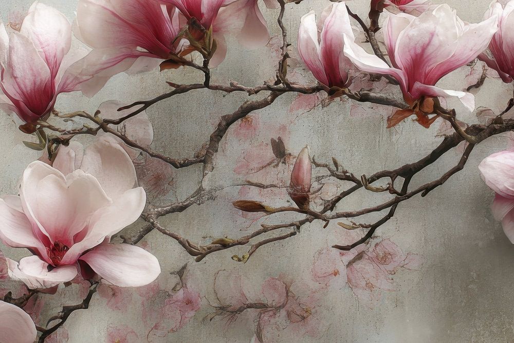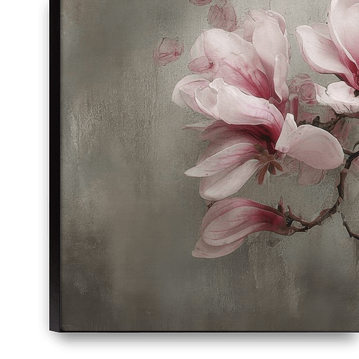 An elegant branch laden with pink magnolia blossoms stretches across the design, featuring delicate branches and soft colour transitions. The flowers create a warm, romantic feel without being overpowering.