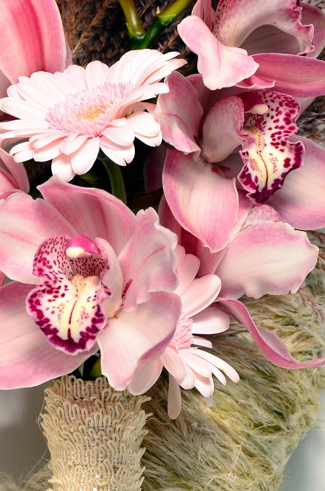 Detail foto van een krans met roze orchideeën en een roze Gerbera