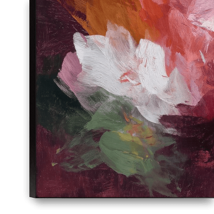 A captivating abstract painting in which warm pink, red, and yellow hues intertwine around suggestive floral shapes. With explosive brushstrokes and delicate white accents, this work creates an atmosphere of romantic passion and movement, where classic floral motifs escape into contemporary expression. The contrast between vibrant…