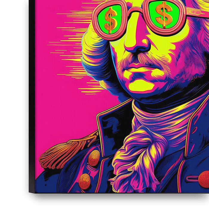 This Pink Pop Art painting of George Washington surrounded by dollars is a vibrant addition to your interior. Experience the vibrancy of 1950s and 1960s Pop Art with this outdoor canvas called Pink Revolution. Perfect for both indoors and outdoors, the artwork brings a wave of energy to your space for autumn or dark days.