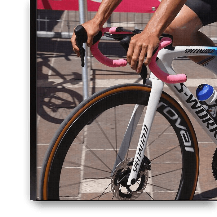 Remco Evenepoel rode in pink for several days at the 2023 Tour of Italy. As world champion, his bike got an extra touch. These are unique days for a cyclist, and one of the only stage races where you can get this beautiful colour. On his way to the podium the day after his stage victory in the opening time trial. Enjoy this unique Fresco.