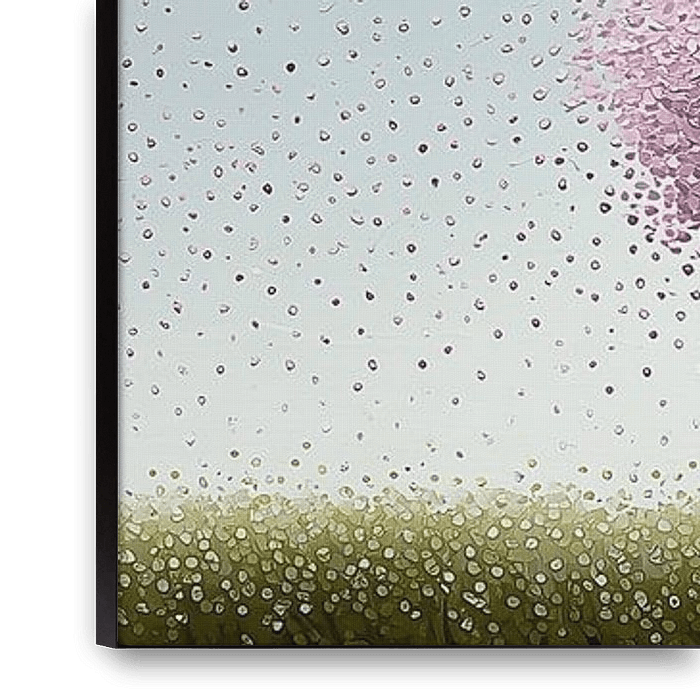 Roze Lint Veld - In één oogopslag valt twee dingen op: de rij zachte, rozerode bloesembomen en de stoïcijnse zwarte-witte koeien die eronder langzaam grazen. Het is alsof de lucht boven het veld permanent lichtroze confetti laat regenen — kleine stippen verf die de kroon van elke boom vormen en langzaam naar beneden dwarrelen. De compositie ademt rust; de bomen geven ritme, de koeien geven schaal, en samen vertellen ze een eenvoudig verhaal van lente en stilte.