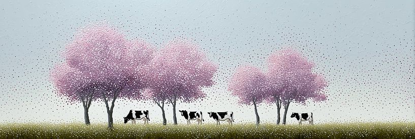 Waarom de kunstenaar dat deed: door de herhaling van bomen en koeien ontstaat een rustige cadans, als een langzame mars. De felroze toppen contrasteren met de ingetogen weide en de zwart-witte koeien; dat contrast is precies de grap van het werk: herkenbaarheid (koeien in een weide) gecombineerd met een bijna feestelijke kleurkeuze (bloesem als poëzie). De afdrukkerige, pointillistische aanpak laat het licht trillen; het zorgt dat het schilderij tegelijk vertrouwd en verfrissend aanvoelt — een landschap dat niet alleen gezien wordt, maar bijna gehoord en geruisloos beleefd.