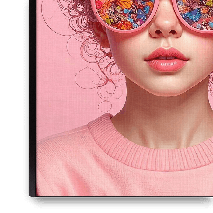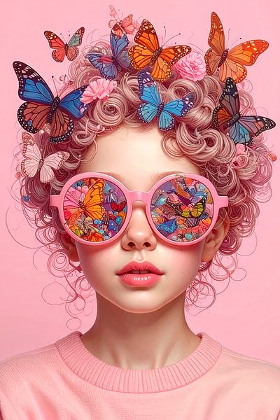 A beautiful girl, with pink curls in her hair, has on pink glasses with the reflection of butterflies in them. In her hair, she has colourful butterflies and small pink flowers, a joy to look at. Her jumper and the background are also pink, as are her lips, will definitely be her favourite colour. A pop art style, surreal, fictional and…