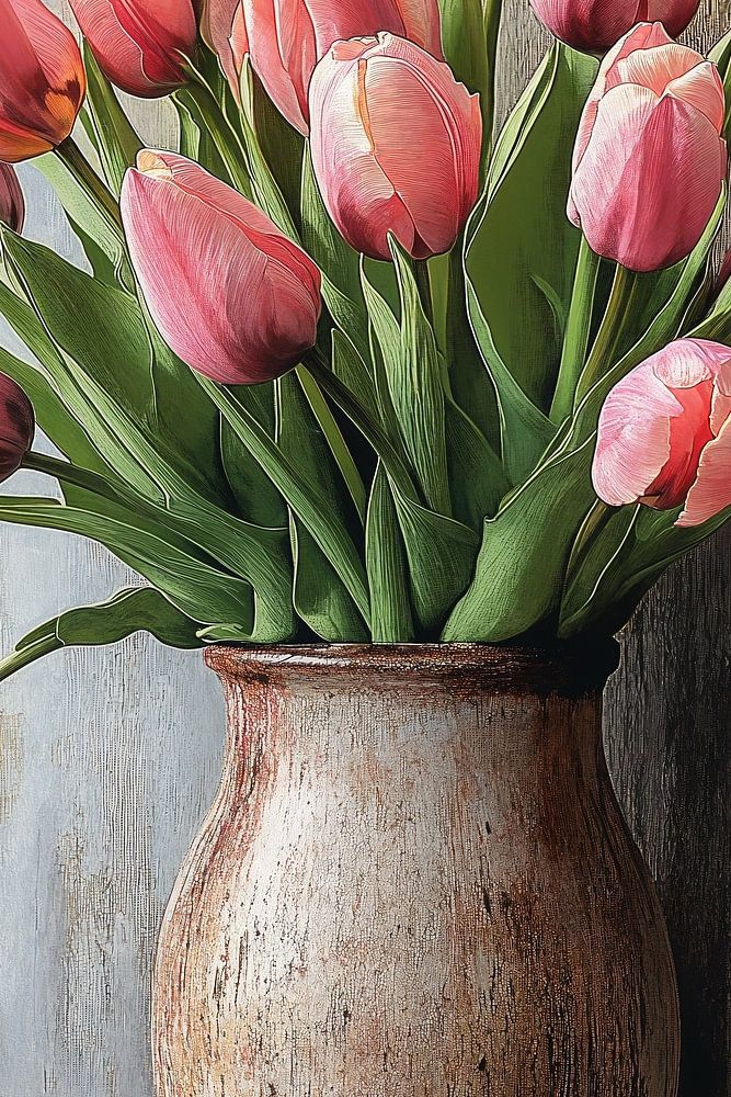 A beautiful composition of red tulips in full bloom, carefully arranged in a robust earthenware vase. The flowers radiate a serene elegance against the backdrop of brushed wood, reflecting the cycle of life and the transience of natural beauty.