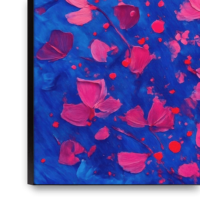 Dancing blossoms fan out over a vibrant background of deep shades of blue. Bright pink petals and playfully scattered red dots provide rhythm, while soft brushstrokes add depth and movement. The contrast between cool blue and hot pink makes the composition fresh and energetic, with a subtle glow in the paint texture. This abstract…