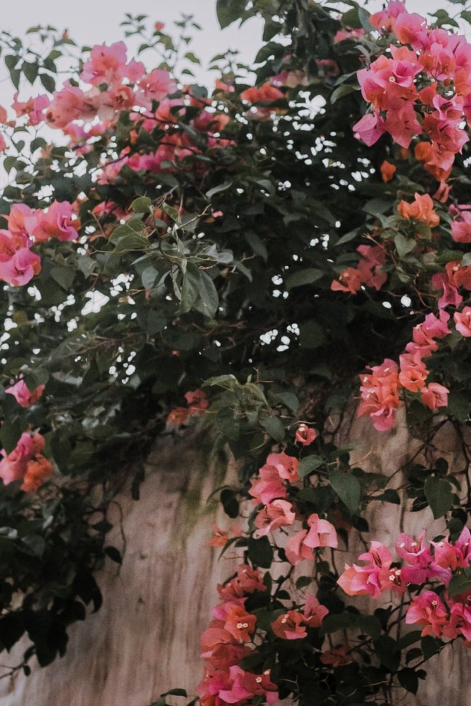 Beautiful pink flowers already blooming over the wall. This image captured during our tour of Mexico.