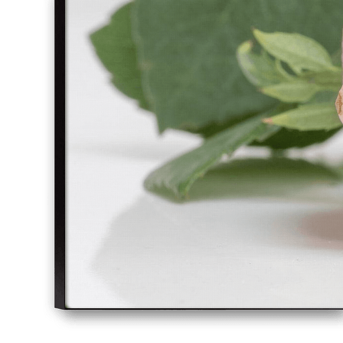 Buy the photo Pink rose on a white mirrored background with its green petals by Dennis Wachtel on canvas, ArtFrame, poster and wallpaper, printed on demand in high quality.
