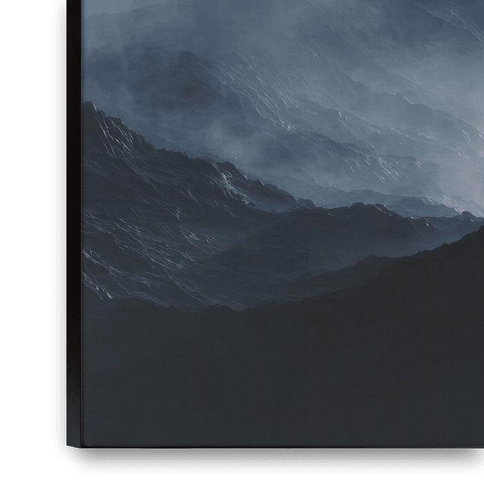 This mountain landscape is bathed in a soft glow of pink and purple, as if the sky gently embraces the relief. In layers of mist and light, distant ridges unfold, ever lighter and thinner as they disappear into the horizon. The shapes are powerful but subdued, their sharpness softened by mist and twilight. The light seems to come from…