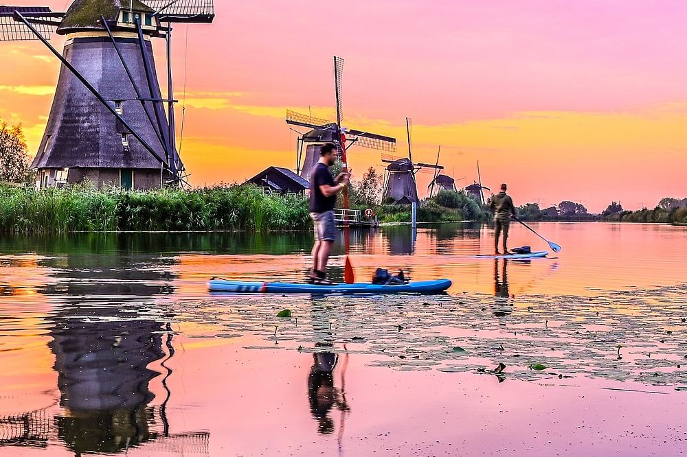 Kinderdijk in pink colour , early in the morning while the sun is rising , peaceful and relaxing