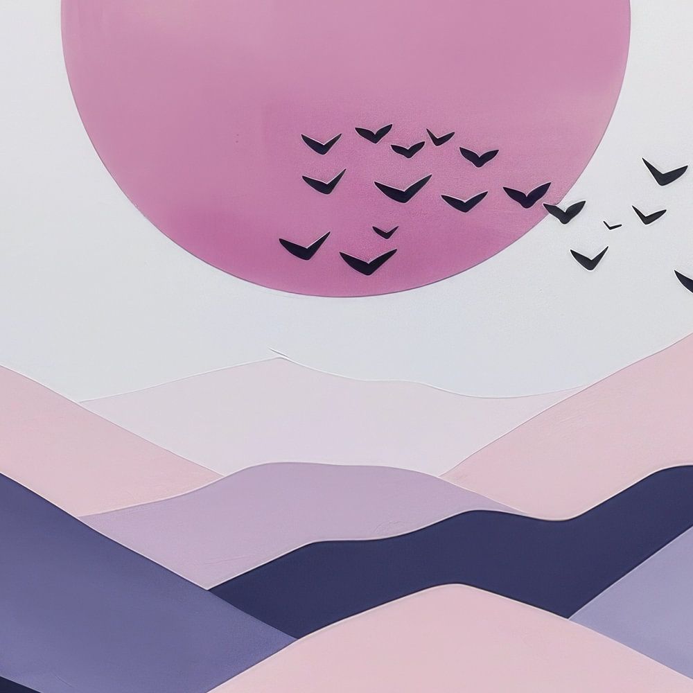 This stunning artwork features a soft pink sunset complemented by a group of flying birds. The harmonious combination of the pastel colours and the minimalist landscape creates a calming atmosphere, perfect for living rooms, bedrooms or offices. An ideal piece for anyone who loves modern yet dreamy decorations. Add a peaceful and elegant touch to your space with this beautiful wall art.