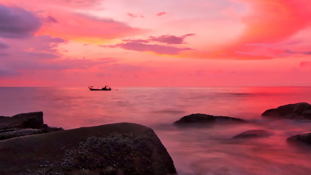Fraaie roze zonsondergang in Khao Lak, Thailand, met een typische vissersboot aan de horizon en rotspartijen op de voorgrond.