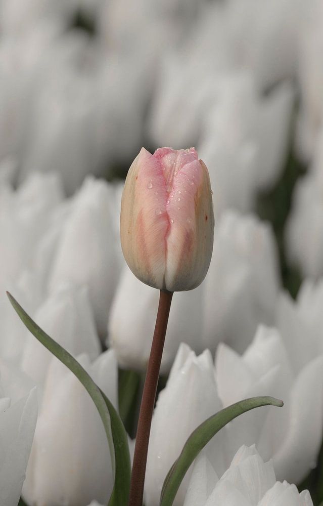 A beautiful pink tulip, still wet from the rain, gets lost in the white tulip field. Lonely, but not alone, it stands out above all the tulips, attracting attention. The field of tulips is on the island of Goeree-Overflakkee in the province of South Holland in the Netherlands.