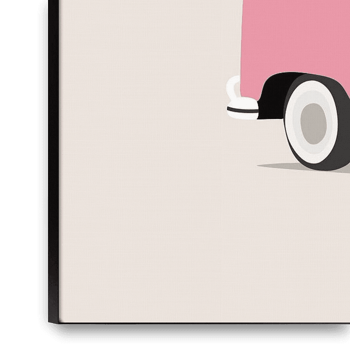 Abstract illustration of a pink Volkswagen van on a light warm gray background. The colors give a nice fresh look!