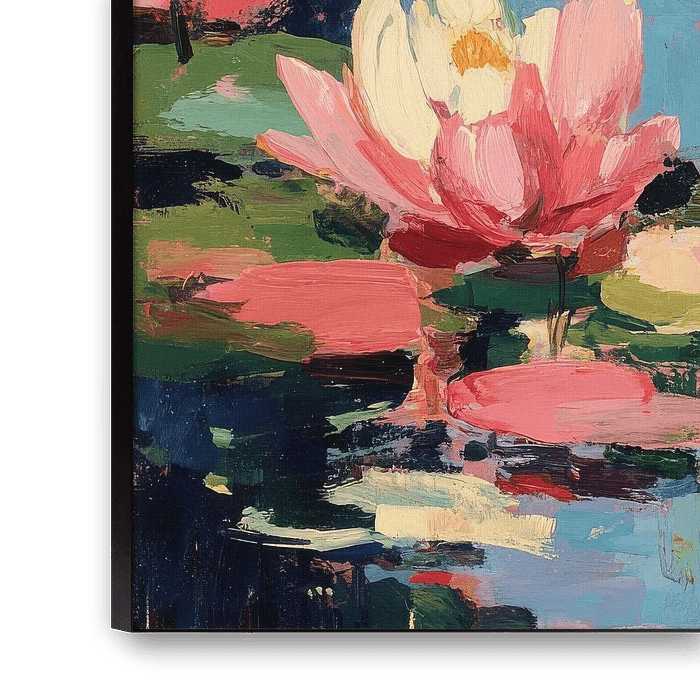 This expressive painting depicts three large pink water lilies with yellow centres floating on green lily pads above a tranquil pond. The flowers are painted in thick, textured brushstrokes, emphasising their soft blossom shape. The background consists of vibrant shades of blue, green and yellow, which create depth and movement through loose, gestural brushstrokes. The composition appears balanced, with the water lilies as a clear eye-catcher. The bold colours and visible texture give the painting a calm, natural atmosphere full of vibrancy.
