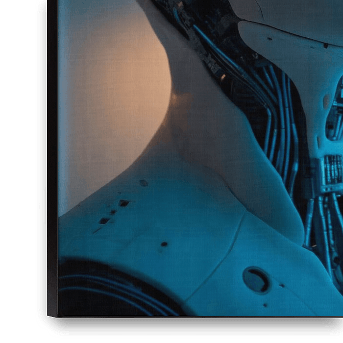 A humanoid robot with a smooth, almost human-like surface and expressive, glowing eyes unfolds in soft, futuristic light. Its contemplative gaze encourages reflection on technology and the future. Ideal for a modern living room or a creative office, this artwork adds a touch of science and philosophy to any room.