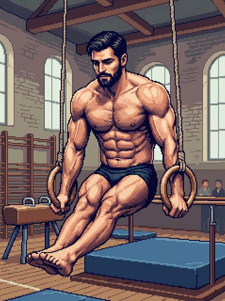 A powerful pixelated figure trains using suspension rings in the gymnasium.