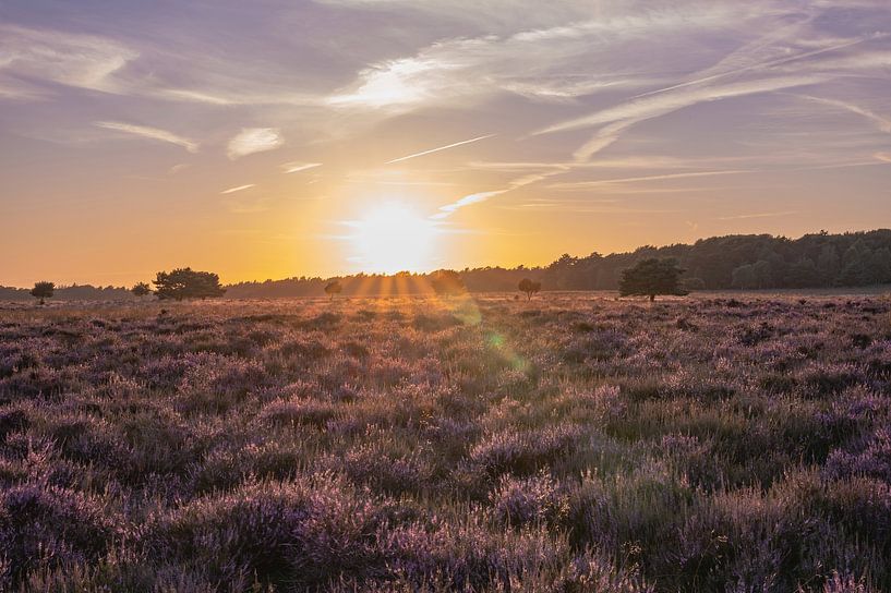 Landscape at Planken Wambuis in Ede, Gelderland, with a view on the flowering heather, and the sun setting