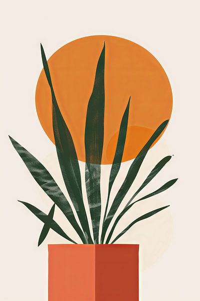 This painting shows a stylised plant in an orange pot standing in front of a bright orange sun. The vibrant green tones of the leaves harmonise wonderfully with the warm tones of the background, creating a lively yet calming effect. The clear lines and minimalist depiction give the picture a modern aesthetic. Inspired by abstract art,…