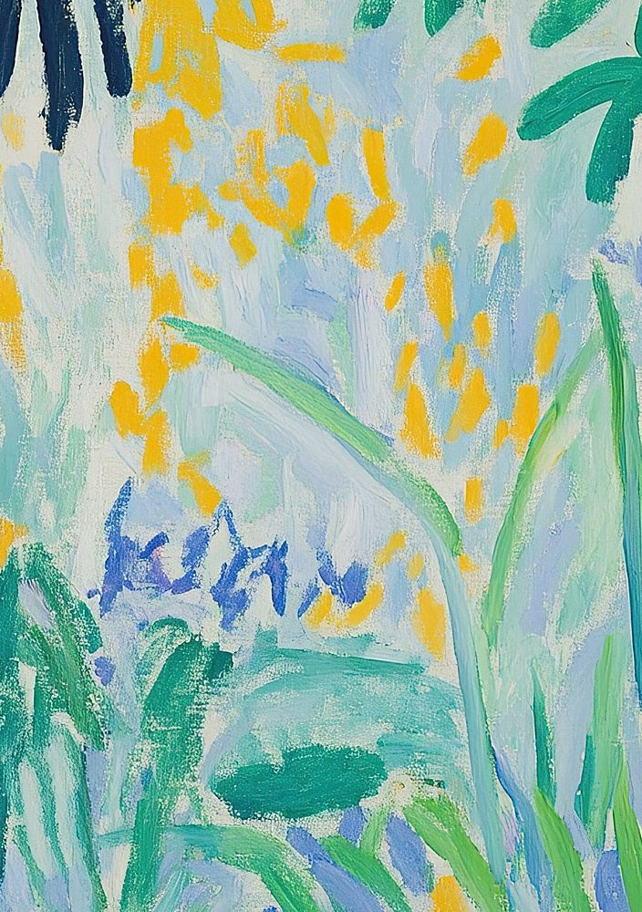 Painting of a garden with blue, green, and yellow flowers, irises, ferns, and monstera plants. The painting features soft brush strokes, a broad paint palette. The colour palette is similar to Matisse's work, with thick lines and simple shapes, lacking in detailed rendering.