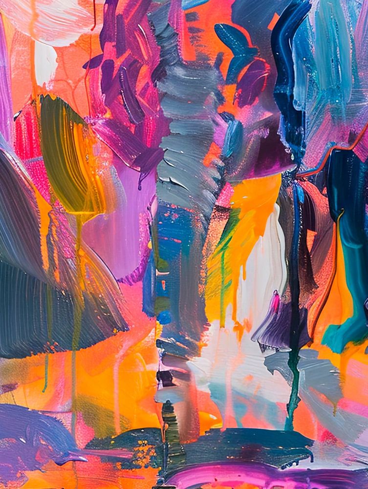 A dreamlike landscape awakens in a dazzling play of colours. Violet and orange nuances merge, while gentle brushstrokes convey a sense of movement and light. A mysterious watercourse reflects the vibrant colour palette and invites the viewer to immerse themselves in this abstract world. Mysticism and emotion are in perfect dialogue here.