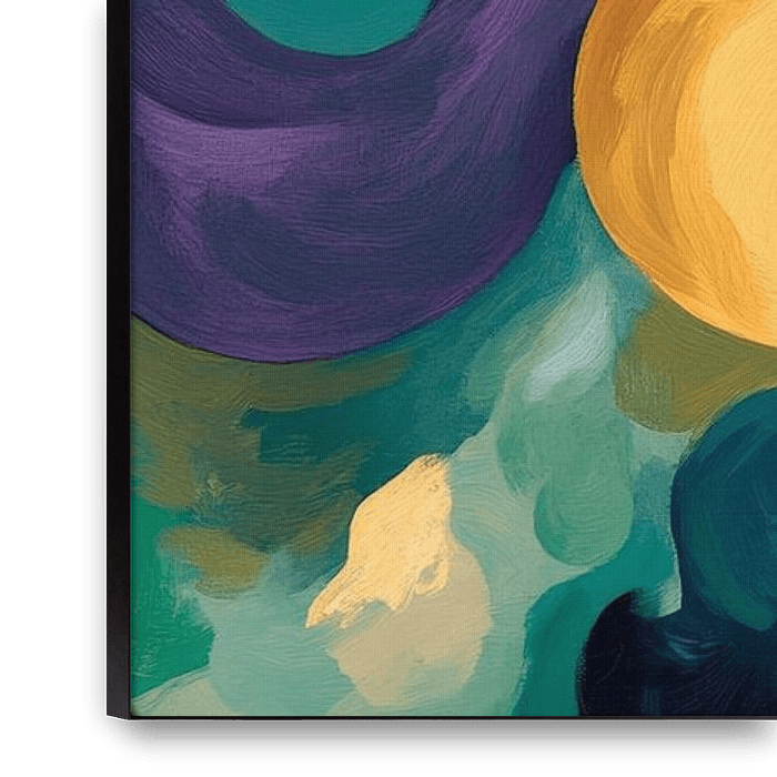 Wavy shapes dance in harmonious colours, from soft turquoise tones to warm golden nuances. This dynamic composition radiates a calming energy and creativity that fits perfectly into a modern living room or an inspiring office environment. It encourages creativity and invites you to dream.