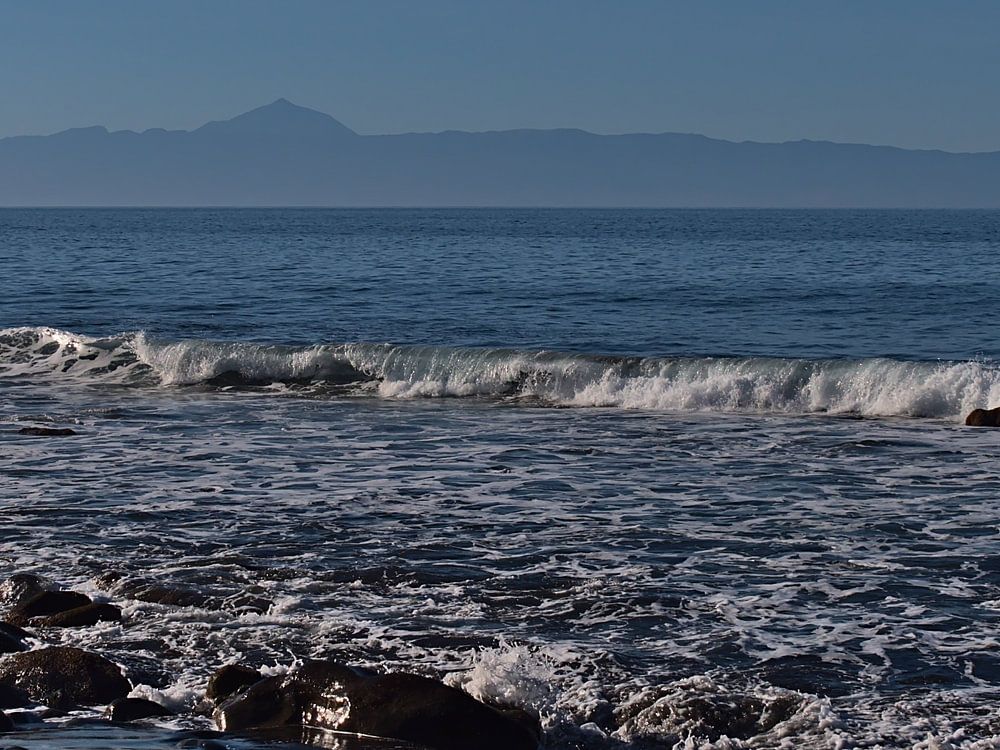 Landscape shot of the remote Playa del Risco beach on the western Atlantic coast of Gran Canaria, Canary Islands, Spain near Agaete with black volcanic rock, waves and the outline of the neighboring island of Tenerife with Mount Pico del Teide on the horizon.
