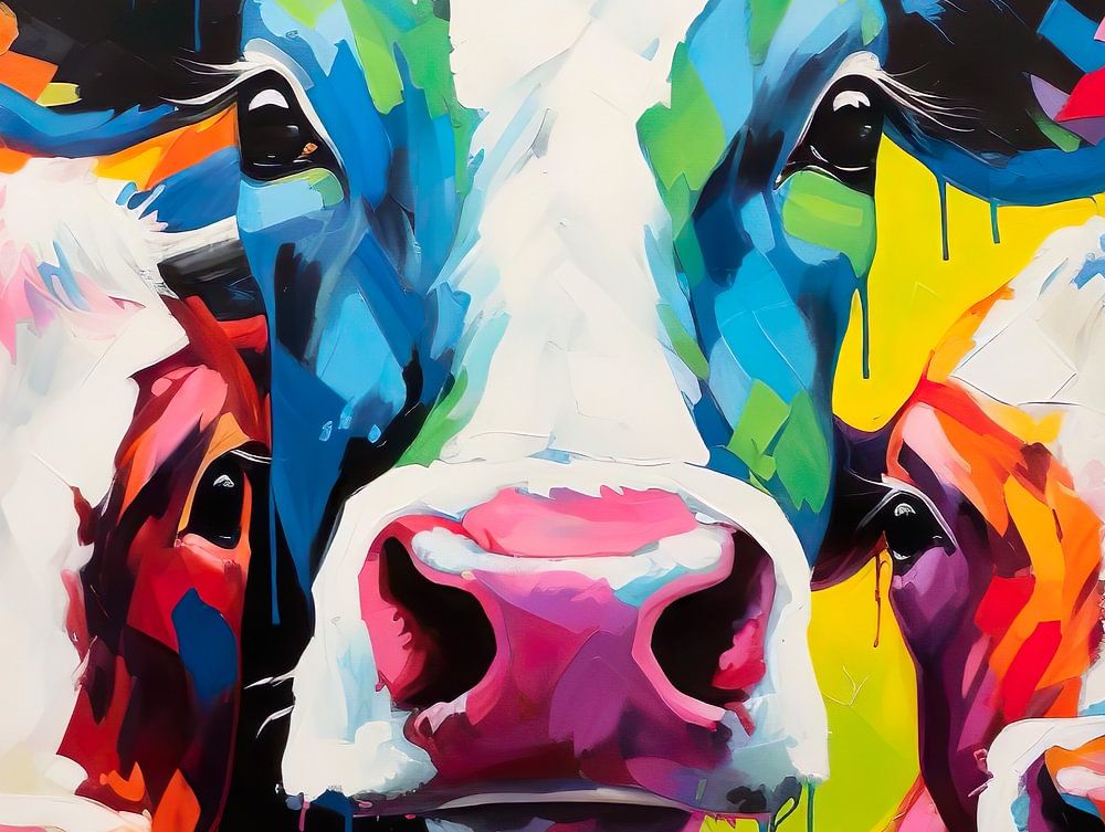 This vibrant painting captures the cheerfulness of the countryside with a playful depiction of colourful cows. The vibrant colours splash off the canvas and create an upbeat atmosphere. The cows, each with their own unique colour pattern, look curiously and playfully into the lens.