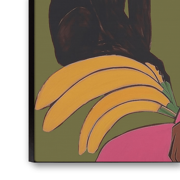 Near her side is a dark brown monkey, with curious eyes and a playful smile. In his hand he holds a bunch of yellow bananas, which form a vivid colour contrast against the soft tones of the woman and her dress. The bananas almost seem to be a playful element of interaction, like an invitation for a light and uncomplicated connection between the two.