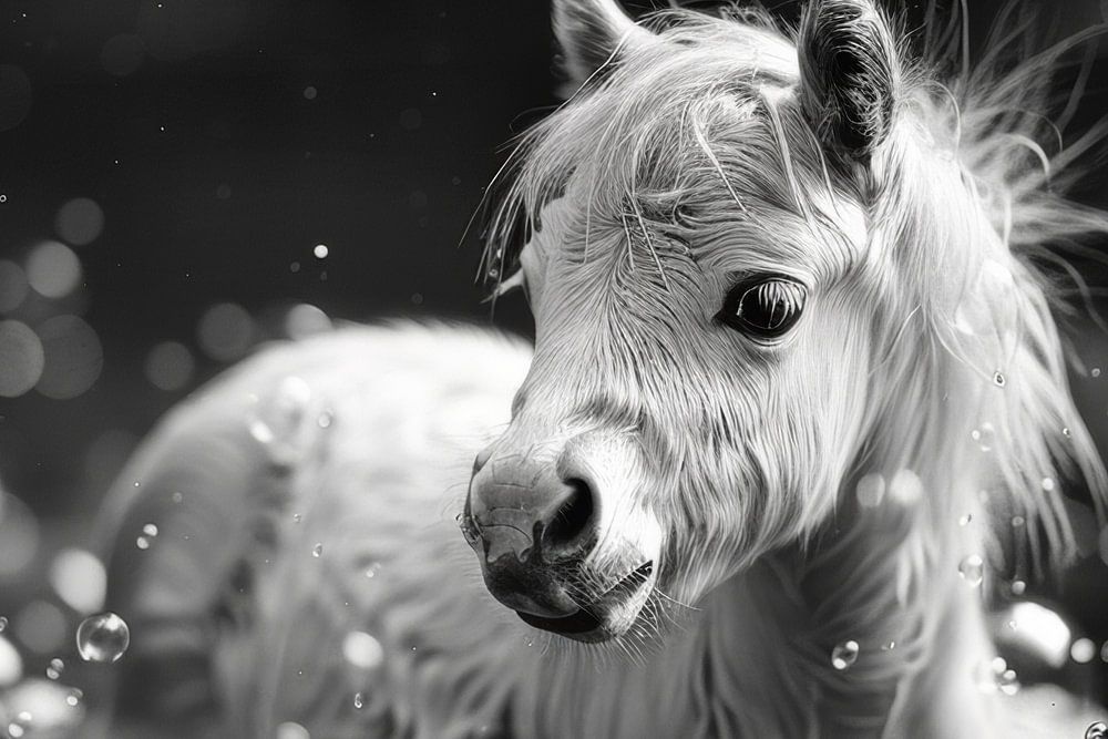 This charming bathroom mural features a playful pony splashing happily in its bath, adding a cheerful atmosphere to your toilet. The black and white photography captures the lively nature of the pony and emphasises the details of the scene, making it an adorable and unique addition to your bathroom decor. Perfect for brightening up your toilet or bathroom, it's a reminder that even cute animals can have moments of joy and play. This modern bathroom picture series offers a refreshing decoration that will not only make you smile, but will also add a cheerful touch to your bathroom. Bring an atmosphere of lightness and joie de vivre into your WC with this charming work of art and be inspired by its playful energy.
