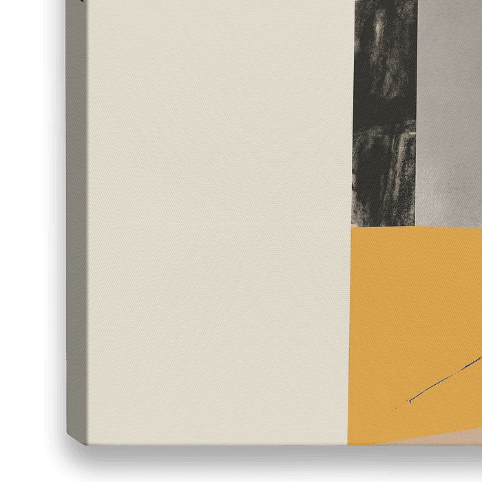 A contemporary abstract piece combining hard-edged geometrics with expressionist scribbles. The composition uses vibrant warm yellows and oranges to convey a sense of pure, unadulterated pleasure. Large, clean-edged colour blocks offer a rational structural beauty, contrasted by spontaneous, almost chaotic scribbles in the upper right…