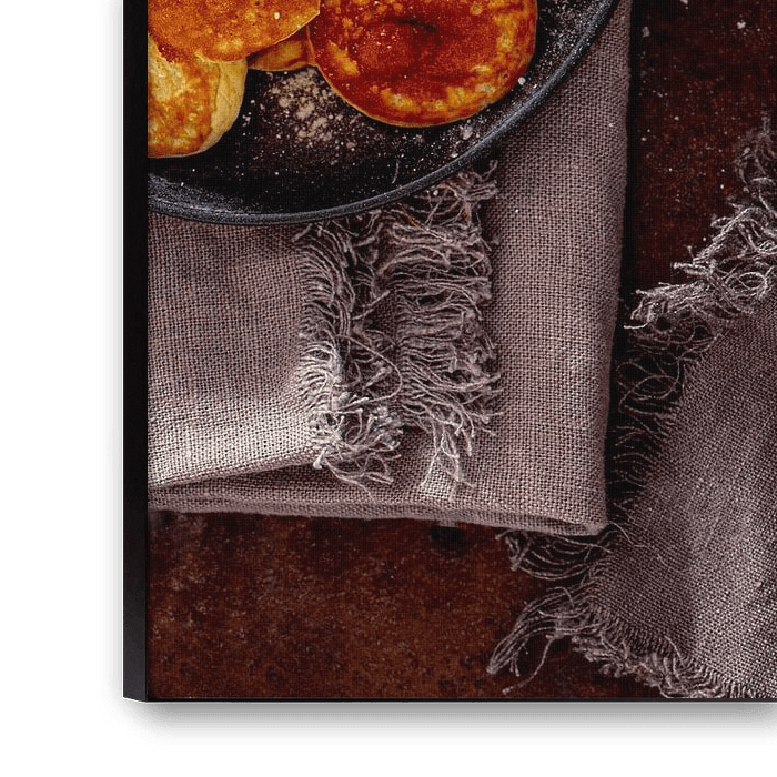 Photo shot from above of 2 plates with poffertjes on dark plates on a dark background with dark linen napkins, forks, bowls with butter and a beer and other drink