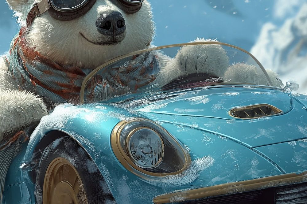 The picture shows a relaxed polar bear, dressed in cool glasses and a casual scarf, sitting at the wheel of a classic, ice-blue convertible. The car glides through a snow-covered landscape, surrounded by majestic, snow-capped mountains that seem to touch the sky in the distance. Snowflakes swirl in the air while the sun casts a soft glow on the scene, giving the feeling of a calm but chilly winter drive. The polar bear appears calm and content, almost as if he were on a Sunday outing, far away from the hustle and bustle of everyday life. His paws clutch the steering wheel and a hint of adventurousness is reflected in his posture. The reflection of the light in his glasses and the slight grin on his face suggest a certain playfulness and enjoyment of the moment. The scene exudes a whimsical and heart-warming atmosphere, transporting the viewer to a world where the boundaries between the wilderness and the pleasures of human existence are blurred