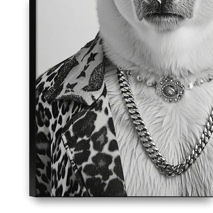 Unique monochrome portrait of a polar bear, stylised with hat, necklace and sunglasses. Artistic depiction of an animal in human fashion.