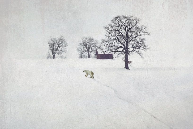 This serene photo shows a polar bear walking peacefully through a white winter landscape. In the distance is a small house - is anyone home? The bear's calm demeanour gives the image a dreamy, almost fairy-tale atmosphere.