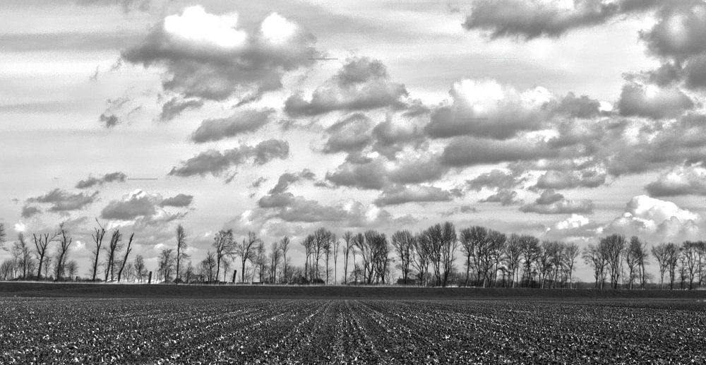As a Dutchman, you don't think about it, but of course it is extraordinary that you are a few metres below sea level when you stand on a straight road in the polder. That the fields around you have been here for four hundred years after the lake was drained by the windmills you also still see. A flat landscape bordered by the dike behind which, a few metres higher than where you stand, lies the ring canal into which the excess water has been pumped away. It is a landscape that only slowly makes itself known. The small differences, the farms, the different crops during the different seasons and the winter barrenness. Here, the field has recently been ploughed and sown waiting for the warmer weather of spring. The trees on the embankment are already budding but not yet in leaf. Above them, the ever-changing sky. The Dutch cloudscapes in the Dutch light. A landscape that always seems the same but never is. It is a place I regularly return to and cycle down the long open straight polder roads. Only with little wind, though.