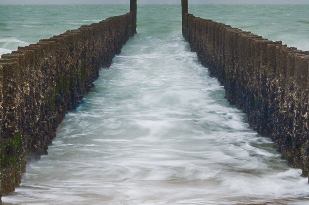 Lovely sea view HDR photo of groynes (also called piers) in the sea on the beach of Zoutelande in Zeeland (Netherlands). A rainy sky is visible from the sea. These poles are not breakwaters, but ensure that the ebb and flow current remains off the coast.