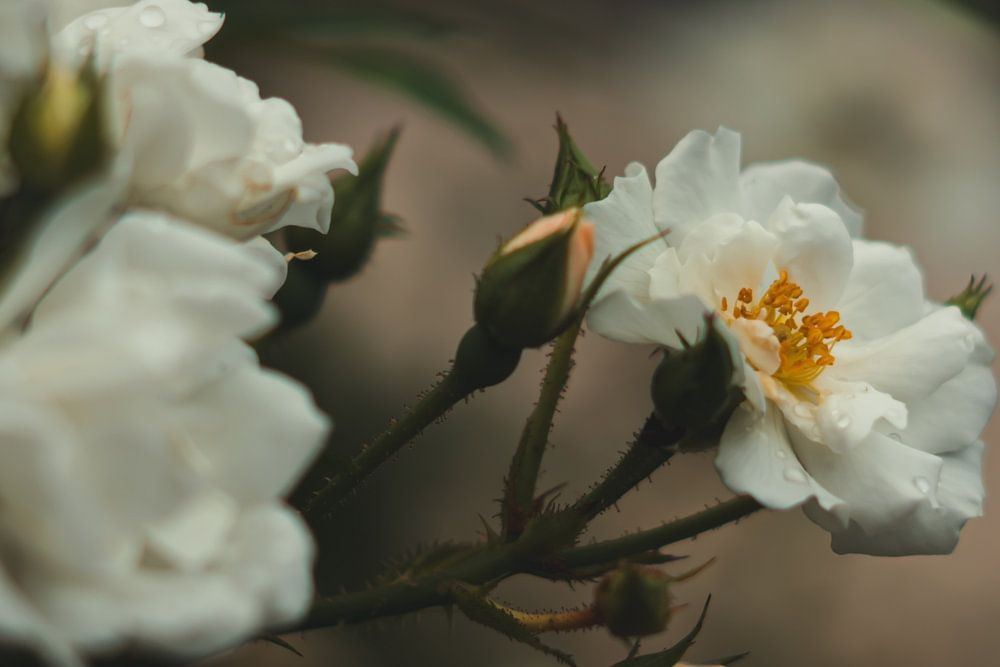 beautiful white polyantha rose blossoms against a soft, blurred background.