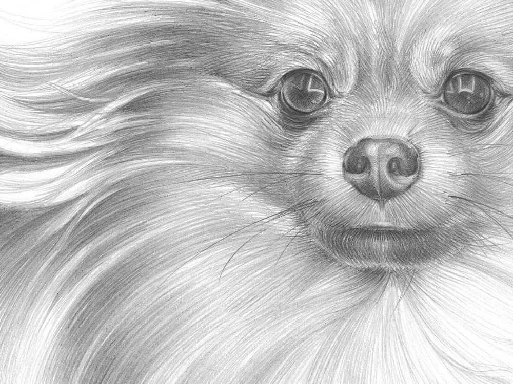 This detailed drawing is dedicated to the face of a fluffy male Pomeranian. It captures the gentle yet proud expression of a small dog. His dark, soulful eyes take centre stage and contrast with the subtle shades of his flowing, light-coloured coat. The dog looks at the viewer head-on. The coat is drawn with fine lines and conveys a lifelike feeling of movement and softness.