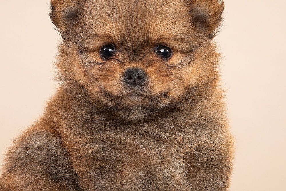 Cute pomeranian dog puppy looking at the camera on a cream colored background