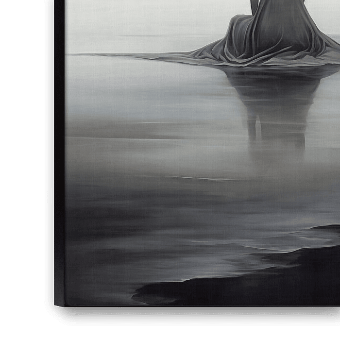 Minimalist portrait of a woman with raised hair in a grey dress sitting quietly in the surf on the beach.