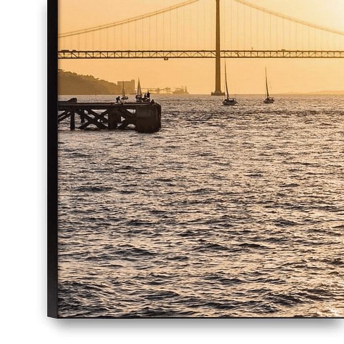 Sailing boats on the Tagus and the Ponte 25 de Abril bridge at sunset in Lisbon, Portugal