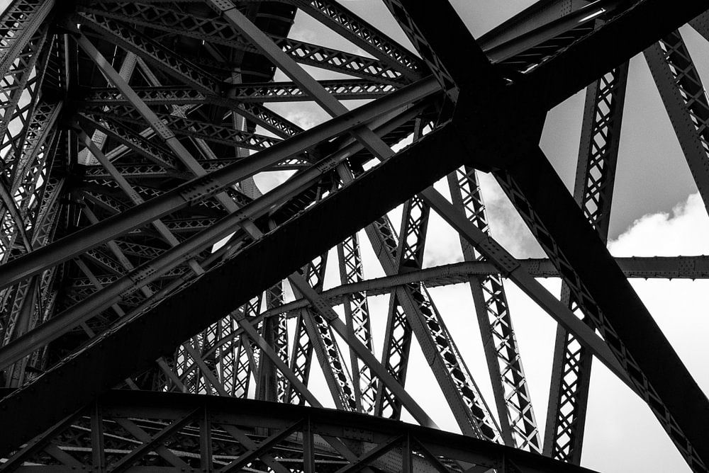 The bridge Ponte Luís I over the river Douro, which connects the city of Porto with Vila Nova de Gaia. Shot taken from the bridge's lower level, showing its steel structure.