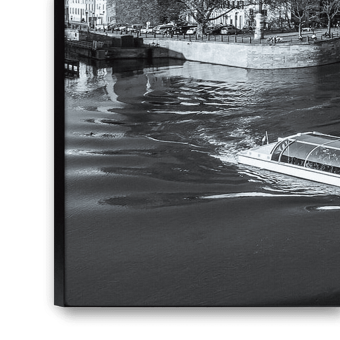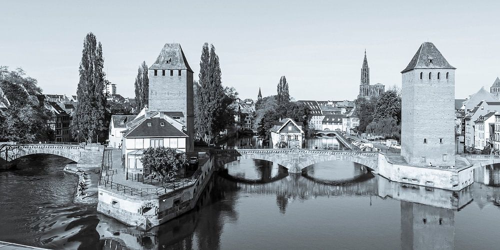 Black and white photography panorama excursion boat on the river Ill at the Ponts Couverts (Covered Bridge) in La Petite France or Tanners' Quarter in Strasbourg, Alsace, France