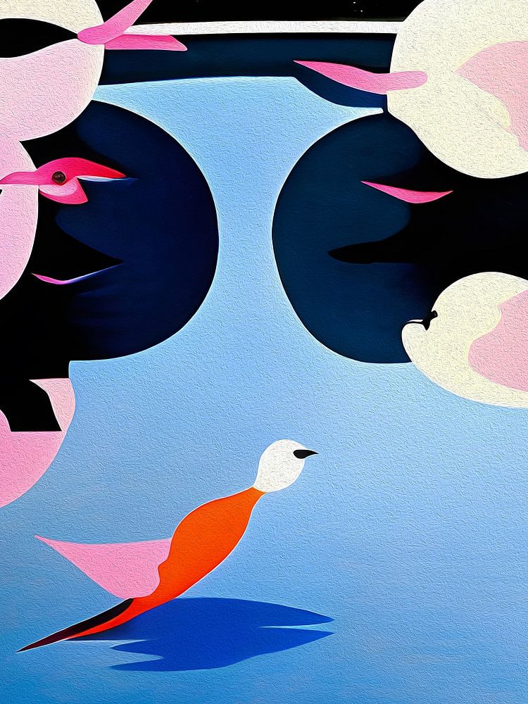 A surreal scene reveals a pool in which pink bird-like shapes are bathing. The strange combination of the pool and the pink birds creates an enchanting and mysterious atmosphere. The birds seem to float above the water, inviting the viewer to explore the limits of the imagination. The scene exudes a dreamlike and wondrous atmosphere.