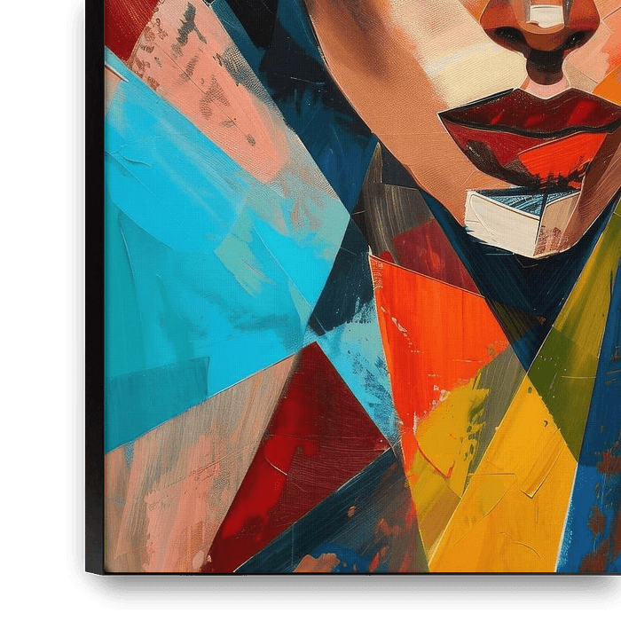 This stunning artwork features a stylised portrait of a woman that catches the eye with its vibrant colours and geometric shapes. The intense blues, reds and yellows blend harmoniously to create a dynamic and expressive image. Ideal for modern living spaces or offices, this painting adds a touch of energy and sophistication to any…