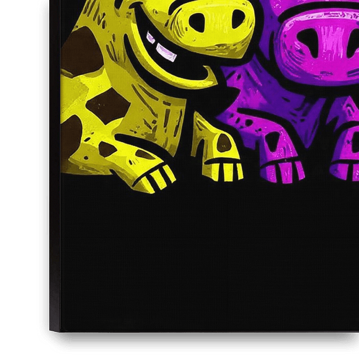This artwork depicts four colourful cartoon cows that stand out playfully and expressively against a deep black background. Each cow has its own character and striking appearance: a yellow cow with brown spots and a cheerful expression, a purple cow with cool sunglasses, a blue cow with big eyes, and an orange cow with brown spots and a…