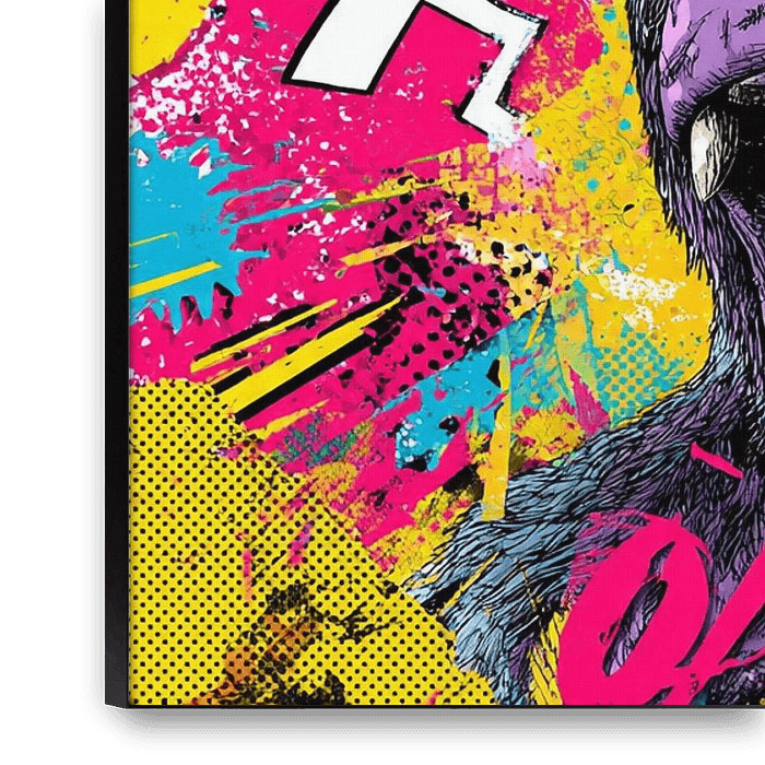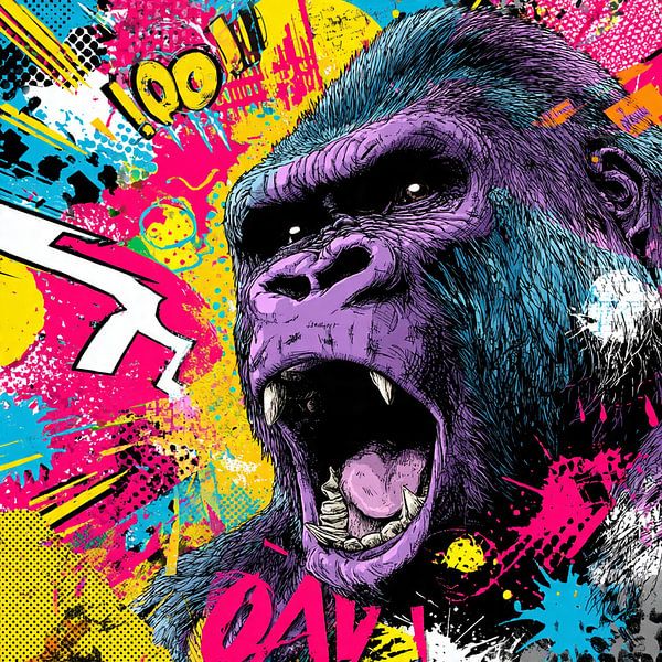 This artwork depicts a powerful and colourful gorilla head with an open mouth and expressive facial expression, contrasting sharply with a dynamic background. The gorilla is rendered in vibrant shades such as purple, blue, pink and yellow, combined with energetic brushstrokes and abstract shapes. The bright colours and explosive…