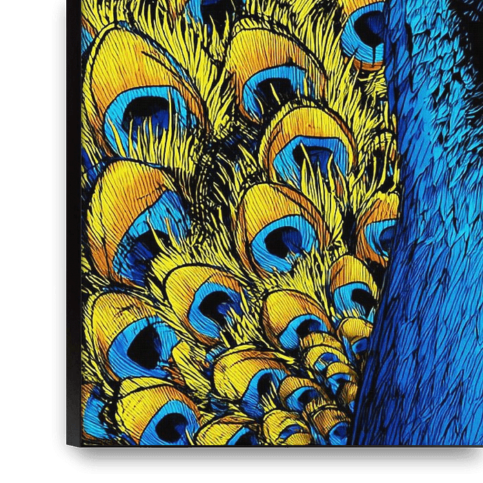 This artwork depicts a majestic peacock that dazzles in an explosion of colour and modern artistry. The peacock is rendered in vibrant shades of blue, yellow and green, with beautifully detailed feathers rich in patterns and textures. The iconic eye-shaped motifs in the tail feathers stand out clearly, giving the animal an elegant,…